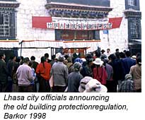 The list was approved by the Lhasa city government in early June 1998, and was read out in full on the Lhasa TV eight o'clock evening news on June 5 1998. Even though some of the 93 protected buildings have been demolished recently [such as Kirey Lobtra, Ganden Khangsar, Samthong], many others are now better looked after than before, and it is believed that the city government will not reverse its decision to keep most of the 93 houses. To sum up, while there has been some action from the government to protect certain religious monuments, and some effort to influence the style of construction in historic areas of Lhasa, previous to the THF cooperation project there has been no official policy to preserve and restore individual historic residential buildings. The June 1998 decision to list 76 buildings marks a genuine shift in official policy towards preservation of the old city. ![]() |