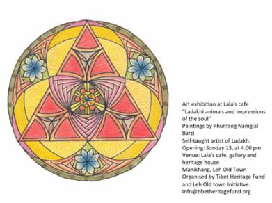 In 2015, THF/LOTI organised at Lala’s café an art exhibition showing ‘Ladakhi animals and impression of the soul’, the paintings of Ladakhi artist Phuntsog Namgial Barzi. Phuntsog was born in Phyang village in 1965 and completed his studies at the Central Institute of Buddhism with an (M.A) in Buddhist philosophy in 1989. He joined the State Education Department as a teacher in 1991. While working in various schools he did many paintings related to text books on the walls of schools and he has been actively sharing his art with other teachers. In 2006 he engaged in the preparation of paintings for Bhoti (Tibetan script) textbooks, and in his free time he paints from the soul in any medium he has at hand.