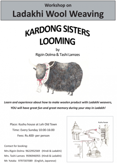 In 2017 two weavers assembled as “the Kardong sisters” in order to organize traditional weaving workshops. THF/LOTI invested in a handloom set and provided Kushu house as a venue. The Kardong sisters advertised the workshop through posters placed in the bazaar streets, hotel’s notice boards, and at Lala’s café. The Kardong sisters hosted numerous workshops for tourists, students and visitors. They demonstrated and taught participants about the weaving process, including spinning yarn, preparing the shuttle, setting up the loom and weaving woollen products. Furthermore, they introduced the range of wools and their qualities, and gave insights into basic sources of the natural dyes in Ladakh. Kardong sisters workshops were very much appreciated by the participants who enjoyed this experience. Contact the phone numbers in the poster to book a workshop.