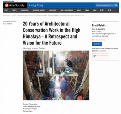 On December the 5th, 2018 the Asia Society, Hong Kong invited Tibet Heritage Fund to give a talk ‘20 Years of Architectural Conservation Work in the High Himalaya – A Retrospective and Vision for the Future’ as part of the Asia Society Heritage in Asia series. For more than 20 years, THF have been working on the conservation, restoration and rehabilitation of Himalayan architecture and cultural heritage, developing a community-based approach to conservation through working on more than 100 conservation projects in the region. Some of these projects have won UNESCO Asia Pacific Cultural Heritage Conservation awards. Pimpim de Azevedo and Yutaka Hirako presented their efforts to preserve this unique architectural heritage and their vision for the future.