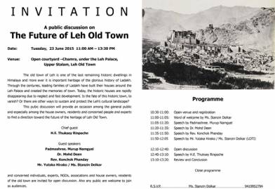In June 2015, THF/LOTI organized a public discussion about "The Future of Leh Old Town". This public discussion provided an occasion for the general public and especially for the house owners, residents, concerned people and experts to find a direction toward the future of the heritage of the Leh old town. H.E. Thuksey Rinpoche was the chief guest of this occasion. The following guest speakers; Padmashree Murup Namgyel, Dr. Mohd Deen, Rev. Konchok Phanday, Mr. Yutaka Hirako, Ms. Stanzin Dolkar. Concerned individuals, experts, NGOs, associations and house owners and residents of the old town were invited to take part in the open discussion.