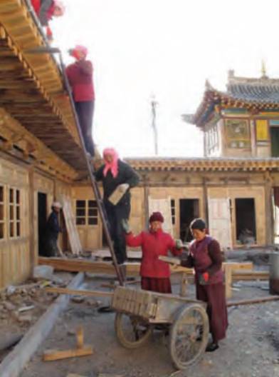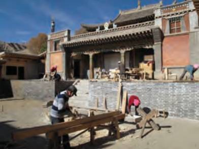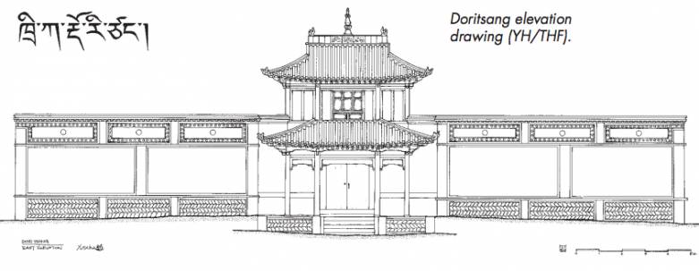Tashi Tinley Drupa Gatseling Monastery, or simply “Doritsang”, lies in Doritsang village, 12km northwest of Trika town. Doritsang was founded in the early 11th century as site for tantric practice among laymen. Many lamas came to give religious teachings and initiations to participants. Doritsang became an important place for Nyingma tantric practice and studies in the region. In the 15th century, a small temple was built and was gradually expanded over the centuries. In 1950, Khyentse Rinpoche visited, promoted medical and astrological practice, trained students and contributed to welfare work. The main assembly hall was destroyed in 1958, and the other buildings occupied as village canteen during the Cultural Revolution. After the reforms of the 1980s, the assembly hall was re-erected, but the rest remained dilapidated. The renovation project was proposed by the Doritsang community in 2009 – they wanted to upgrade the old building complex into a school for Tibetan reading and writing, as well as for religious teaching and practice. Previously, Ngagpa-s and the community had organized religious teaching courses every winter season, and the numbers of participants were growing, participants came from further and further. To assist their stay during the teaching, the community wanted to upgrade the complex into a proper school, with classrooms, library, kitchen, showers and accommodation. Doritsang temple consists of traditional rooms arranged around a yard on two different levels. The lower yard, the older part, has a single storey timber framed building with flat roof, and buildings on three sides, a typical Amdo region traditional architecture. A watchtower is built above the gate, and a stairway connecting to the upper yard. The upper yard has a central the structural repair. The roof was opened to replace rotten timbers, enabling the carpenters to carry on structural adjustment. The east side building was converted into a class room and library with wooden floors and bookcases. The south and west side buildings were converted into accommodation, with dormitories, kitchen and shower room. large monastic assembly hall, which was reconstructed in 1984 with brick walls, Tibetan style timber elements and a gabled roof. The construction work started in 2010. First came the structural repair. The roof was opened to replace rotten timbers, enabling the carpenters to carry on structural adjustment. The east side building was converted into a class room and library with wooden floors and bookcases. The south and west side buildings were converted into accommodation, with dormitories, kitchen and shower room.